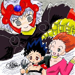 | ゴン: オレとキルアは、旅の途中サラボナって町に着いた。 そこでは、ヒソカのお婿さんを募集してた。 お婿さん・・・って、ヒソカって男だよね? オレはなりゆきでヒソカと戦い、約束のプレートも ちゃんとヒソカに渡すことが出来たんだ。へへ。 そしたらヒソカが「婚約プレート受け取ったから、 ボクと結婚してよね オレ、ヒソカとは戦いたいだけで、結婚したくないよ! ど、どうしようキルア〜。え、他の人と結婚しちゃえ? 次回 天空の2×HUNTER 第42話 「ヒソカの愛×決着×ゴンの本気」 あの、オレ、おさななじみのクラピカと結婚します! |